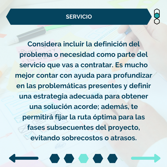 Considera incluir la definición del problema o necesidad como parte del servicio que vas a contratar. Es mucho mejor contar con ayuda para profundizar en las problemáticas presentes y definir una estrategia adecuada para obtener una solución acorde; además, te permitirá fijar la ruta óptima para las fases subsecuentes del proyecto, evitando sobrecostos o atrasos.