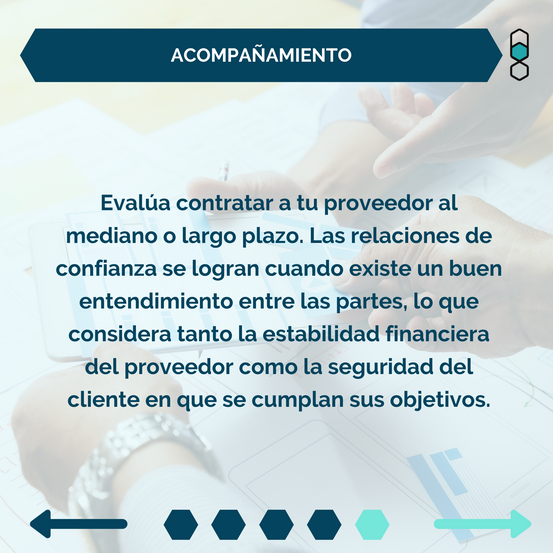 Evalúa contratar a tu proveedor al mediano o largo plazo. Las relaciones de confianza se logran cuando existe un buen entendimiento entre las partes, lo que considera tanto la estabilidad financiera del proveedor como la seguridad del cliente en que se cumplan sus objetivos. Los proyectos digitales y sus resultados pueden tomar varios meses, por lo que evaluar un sistema de pago tipo fee asegura la atención y dedicación necesarias para su éxito, incluso después de entregado.